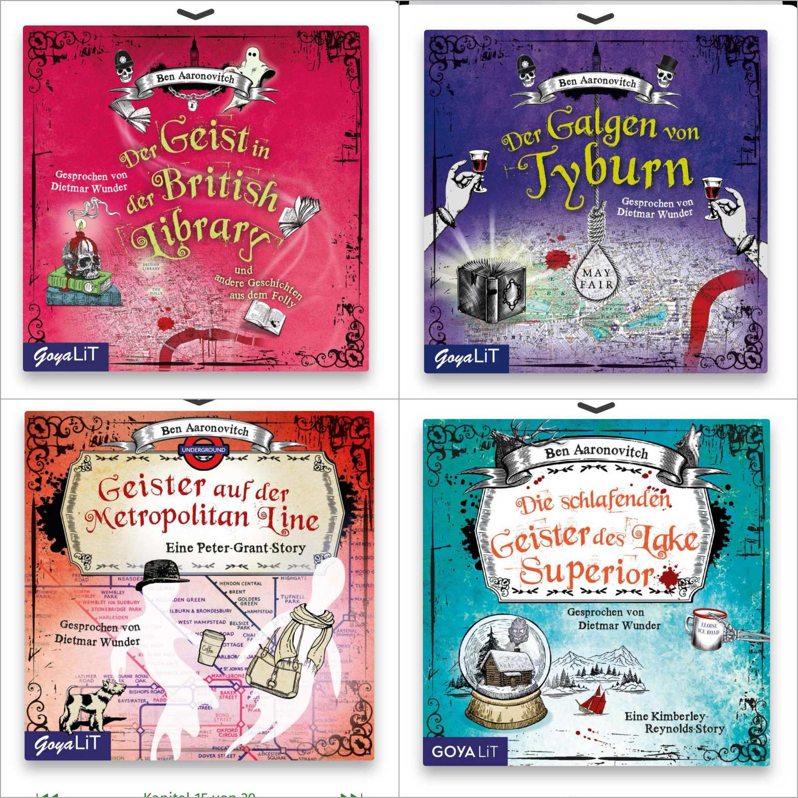 5 Hörbücher konnte ich im September beenden und vier davon waren Geschichten rund um Die Flüsse von London von Ben Aaronovitch. Mit Geister auf der Metropolitan Line und Die schlafenden Geister des Lake Superior habe ich zwei weitere Novellen aus der Welt beendet. Wobei die erste aus der Sicht von Peter Grant erzählt wird, was ich ein wenig schade finde, denn gerade die neuen Blickwinkel wie bei der zweiten aus der Sicht der FBI Agentin Kimberley Reynolds finde ich besonders interessant. Von Peter Grant höre ich ja in der Hauptreihe wie in Band 6 Der Galgen von Tyburn schon genug. 😉